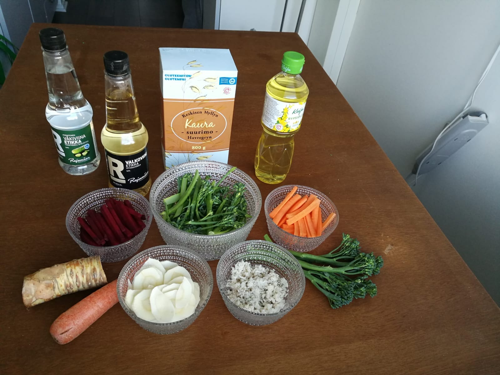 Päädyin tekemään pari eri versiota ja yhden myös riisistä, vertailun vuoksi. Ensimmäisenä kokeilen tehdä mahdollisimman perinteisiä susheja, joissa vain riisi on korvattu kauralla. Halusin kuitenkin kokeilla myös tehdä ihan täysin suomalaisen version, johon olen antanut luovuuteni vuotaa hieman vapaammin.”
