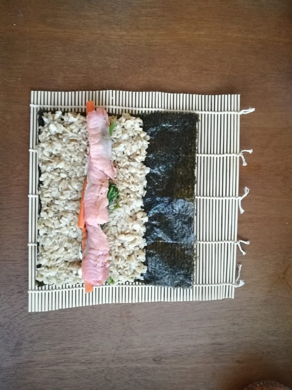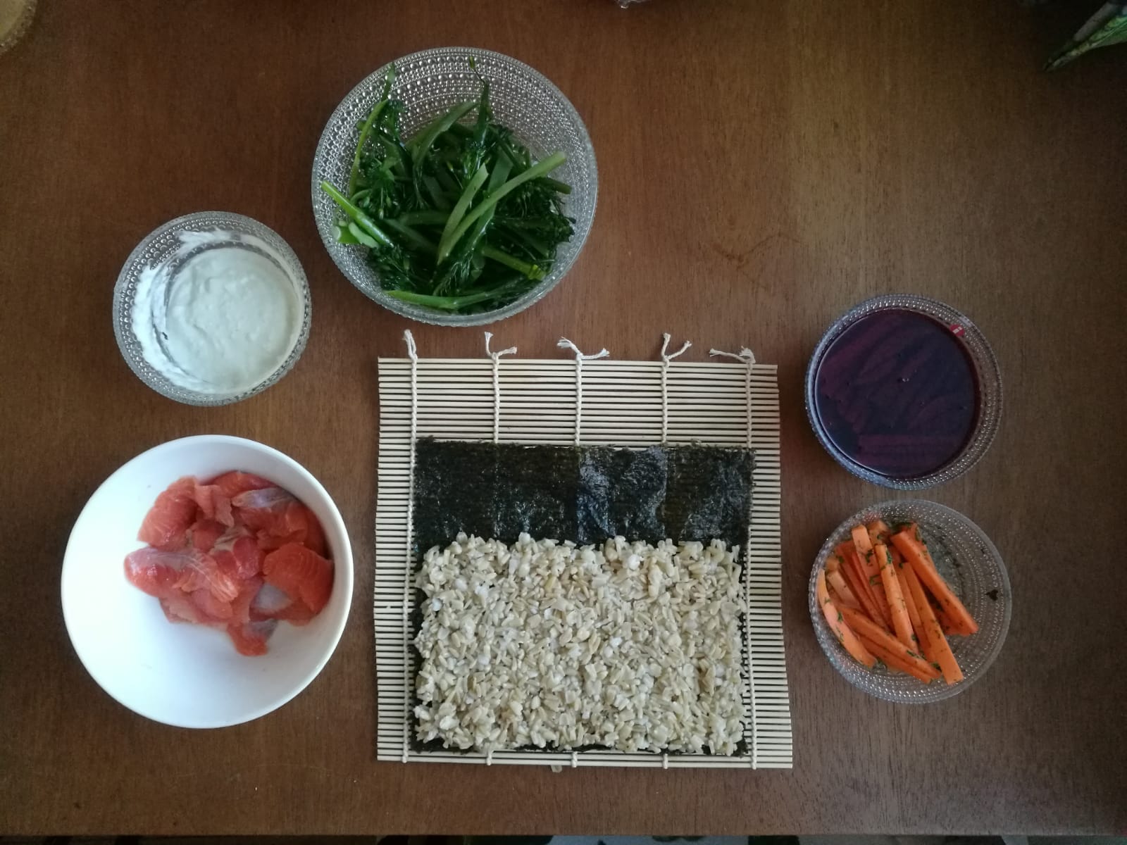 Aluksi pohditutti, miten kaura mahtaa käyttäytyä sushiriisinä. Sushiriisin pitäisi olla kovin irtonaista, mutta kuitenkin hieman tahmaista, jotta se pysyy kasassa.